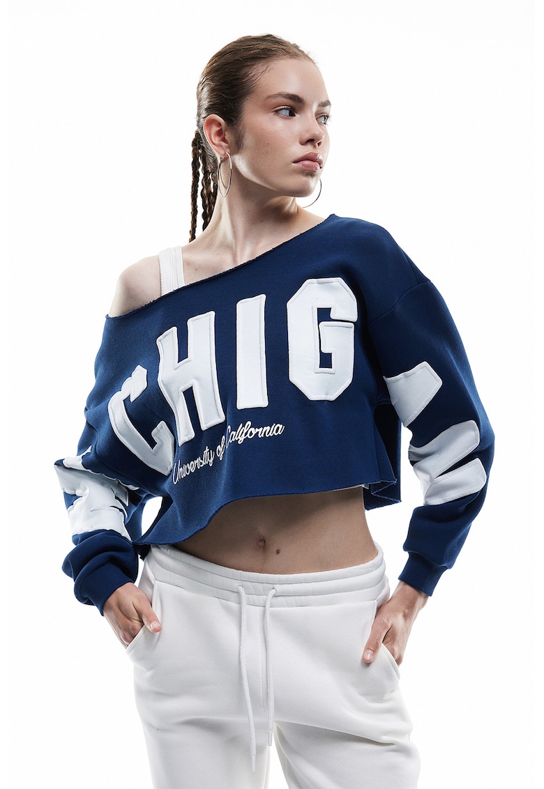 - bleumarin Imprimeu: text Stil: casual Croiala: crop Sistem inchidere: fara inchidere Material: sintetic