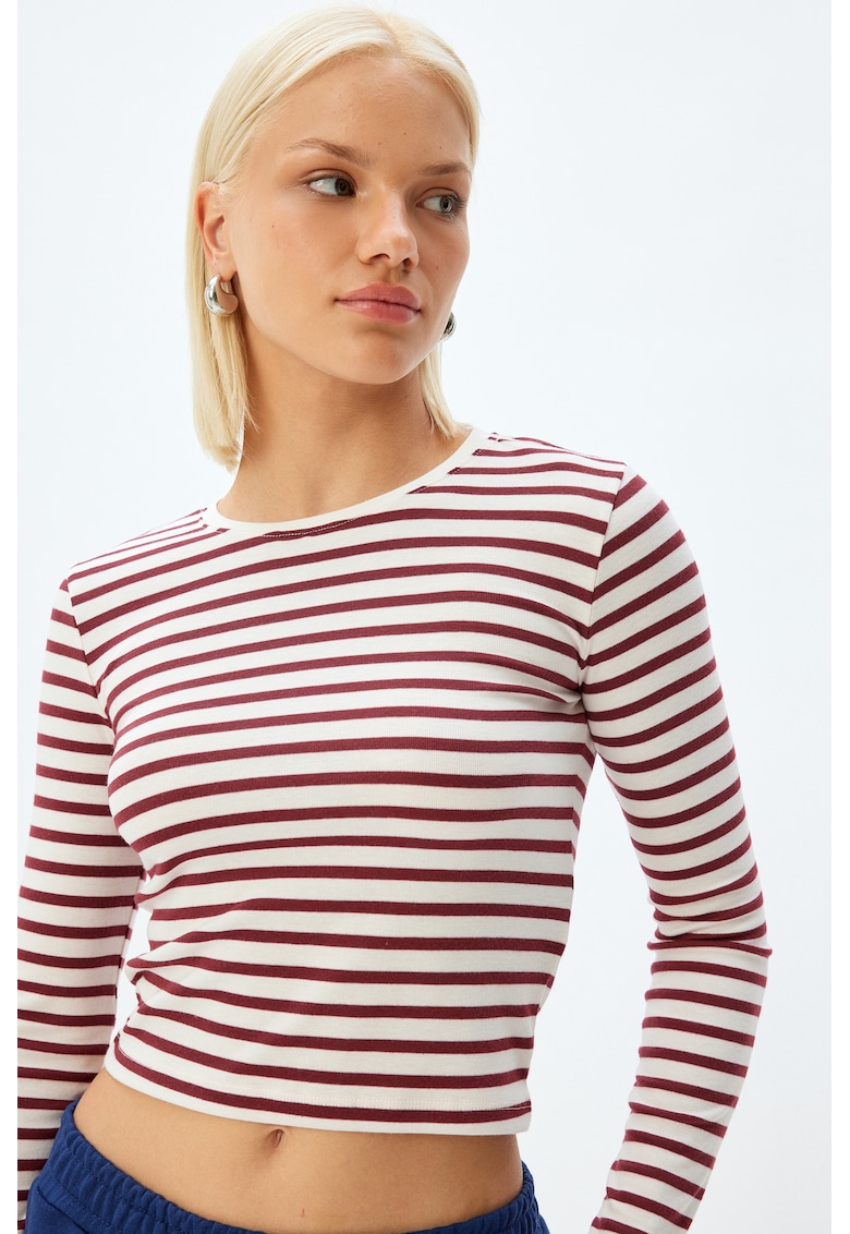 Caracteristici Culoare: visiniu Imprimeu: dungi Stil: casual Croiala: crop Sistem inchidere: fara inchidere Material: poliester