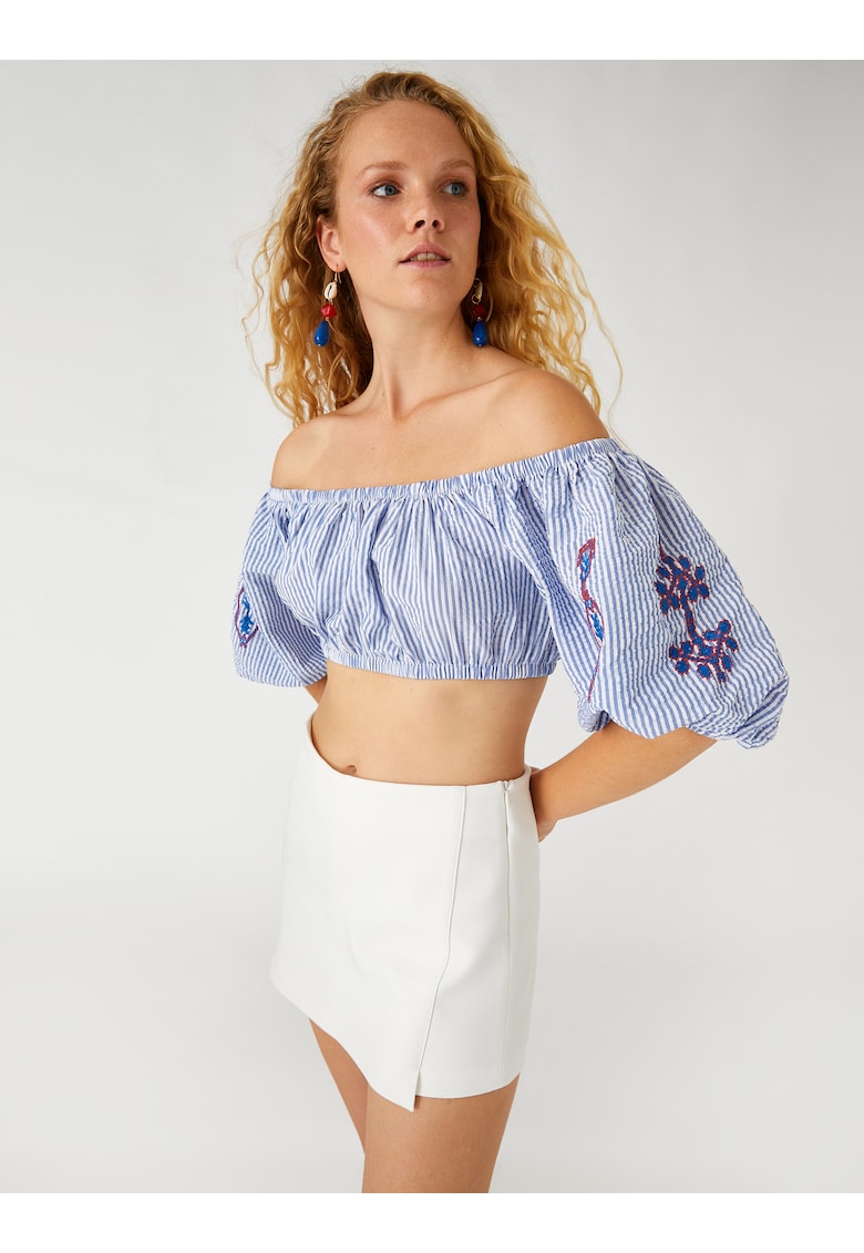 Caracteristici Culoare: albastru Imprimeu: dungi Stil: casual Croiala: decolteu pe umeri Sistem inchidere: fara inchidere Material: sintetic