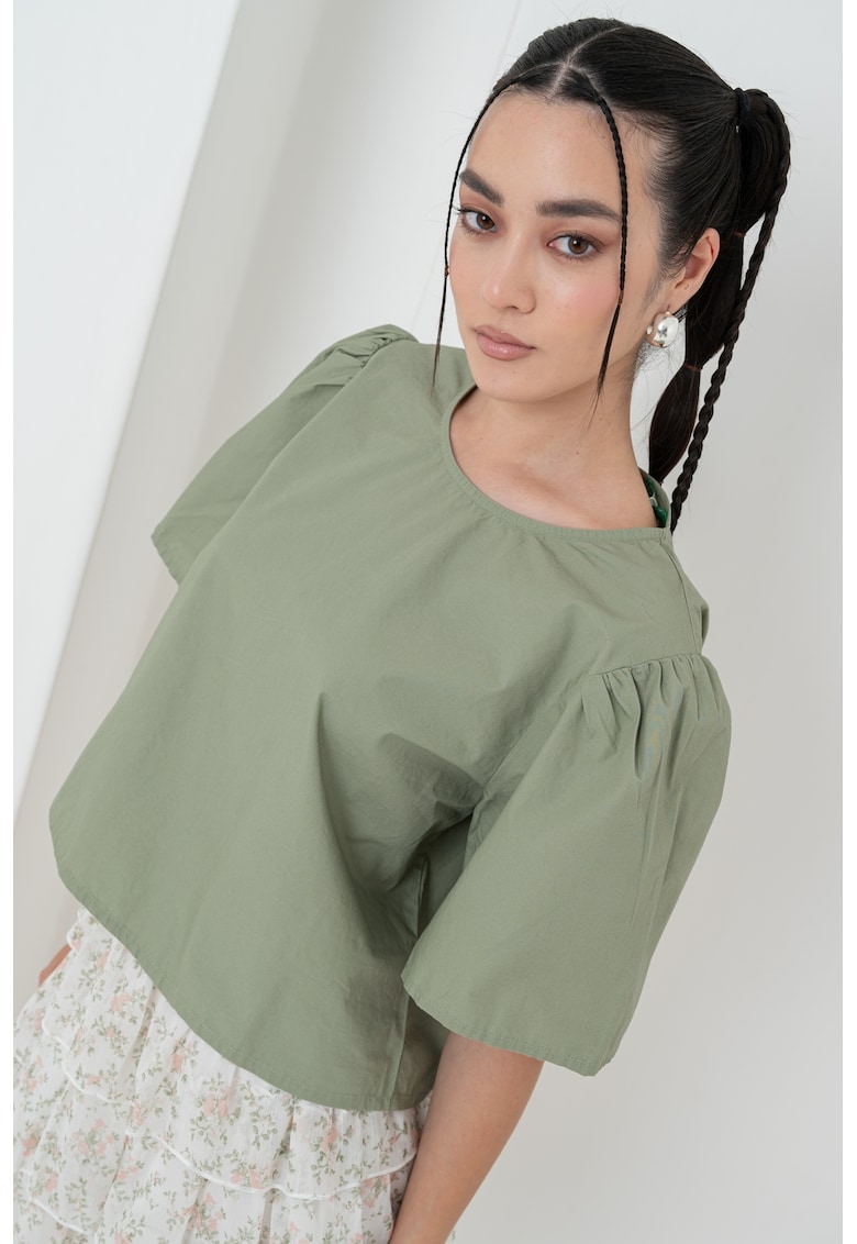 Caracteristici Culoare: verde militar prafuit Imprimeu: uni Stil: casual Croiala: crop Sistem inchidere: nasturi Material: bumbac Decolteu: la baza gatului Maneci: ample Lungime maneca: maneca scurta Compozitie Exterior: 100% bumbac Info model Modelul poarta un produs de marimea S. Marimi model: 170 cm inaltime