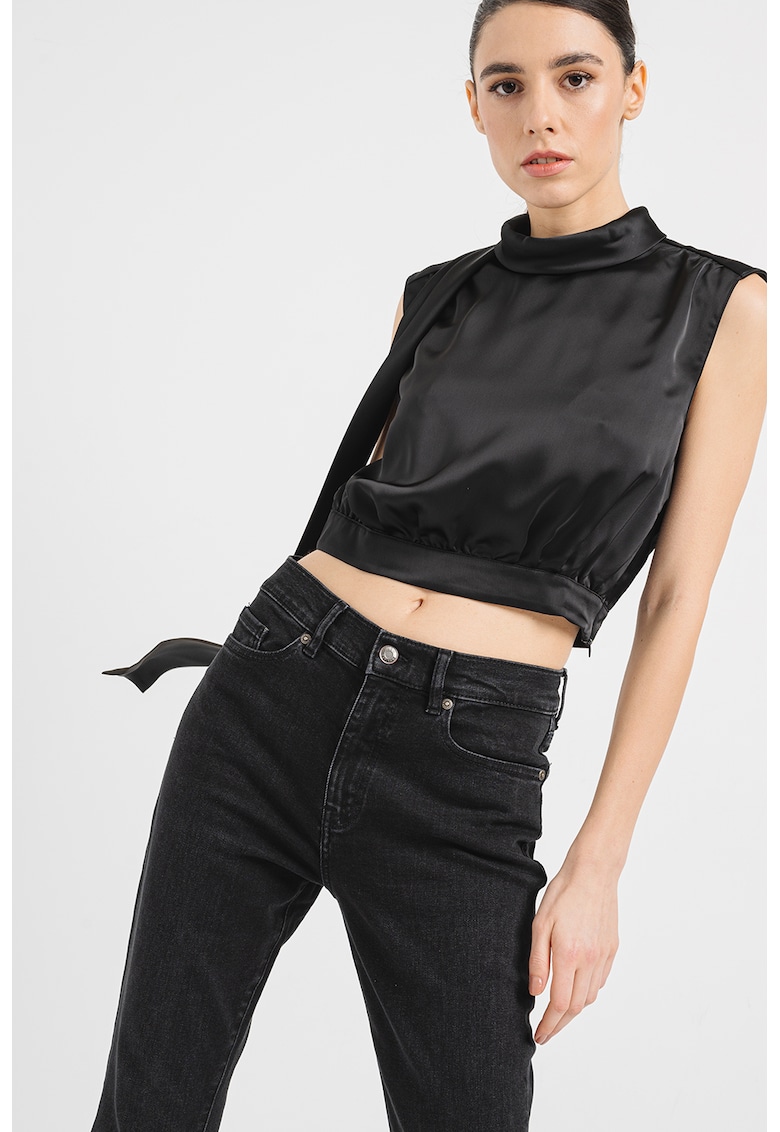 Caracteristici Culoare: negru Imprimeu: uni Stil: casual Croiala: crop Sistem inchidere: fara inchidere Material: poliester Guler: halter Lungime maneca: fara maneca Detalii: aspect satinat Compozitie Exterior: 100% poliester Info model Modelul poarta un produs de marimea S/36 EU. Marimi model: 177 cm inaltime
