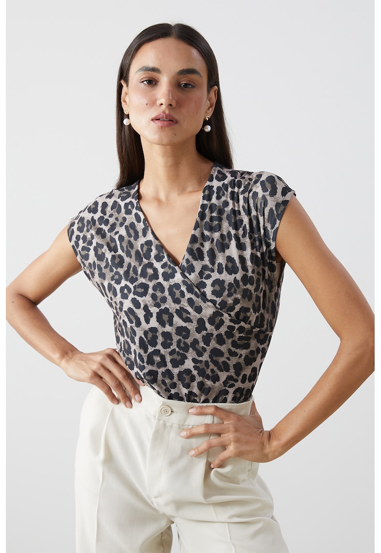 - maro fango Imprimeu: animal print Stil: casual Croiala: regular fit Sistem inchidere: fara inchidere Material: sintetic Decolteu: cache-coeur Maneci: kimono Lungime maneca: maneca scurta Compozitie Exterior: 96% poliester