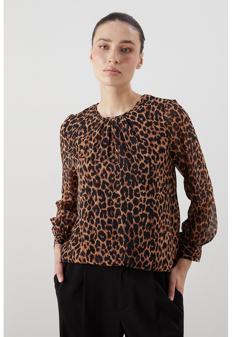 - caramel Imprimeu: animal print Stil: casual Croiala: regular fit Sistem inchidere: nasturi Material: sintetic Decolteu: la baza gatului Maneci: cu mansete cu nasturi Lungime maneca: maneca lunga Compozitie Exterior: 100% poliester Material garnituri: 100% poliester