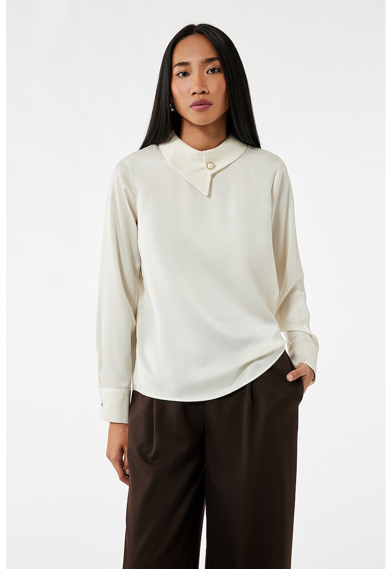Caracteristici Culoare: crem Imprimeu: uni Stil: elegant Croiala: regular fit Sistem inchidere: fara inchidere Material: poliester Decolteu: cu decupaj cu nasture Guler: asimetric Lungime maneca: maneca lunga Detalii: aspect satinat Compozitie Exterior: 100% poliester