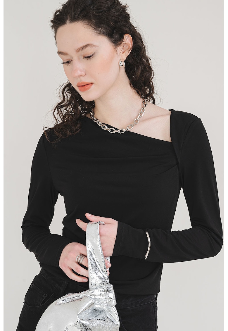 Caracteristici Culoare: negru Imprimeu: uni Stil: casual Croiala: slim fit Sistem inchidere: fara inchidere Material: sintetic Decolteu: asimetric Lungime maneca: maneca lunga Detalii: fronseuri Compozitie Exterior: 96% poliester