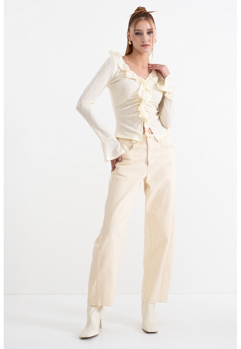 - viscoza Decolteu: in v Maneci: mansete late Lungime maneca: maneca lunga Detalii: aplicatii cu volane Compozitie Exterior: 85% poliester