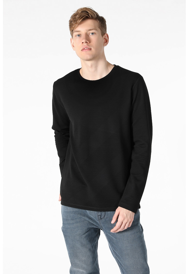 Caracteristici Culoare: negru Imprimeu: uni Material: sintetic Stil: casual Croiala: regular fit Sistem inchidere: fara inchidere Decolteu: la baza gatului Lungime maneca: maneca lunga Detalii: aspect striat Compozitie Exterior: 77% poliester