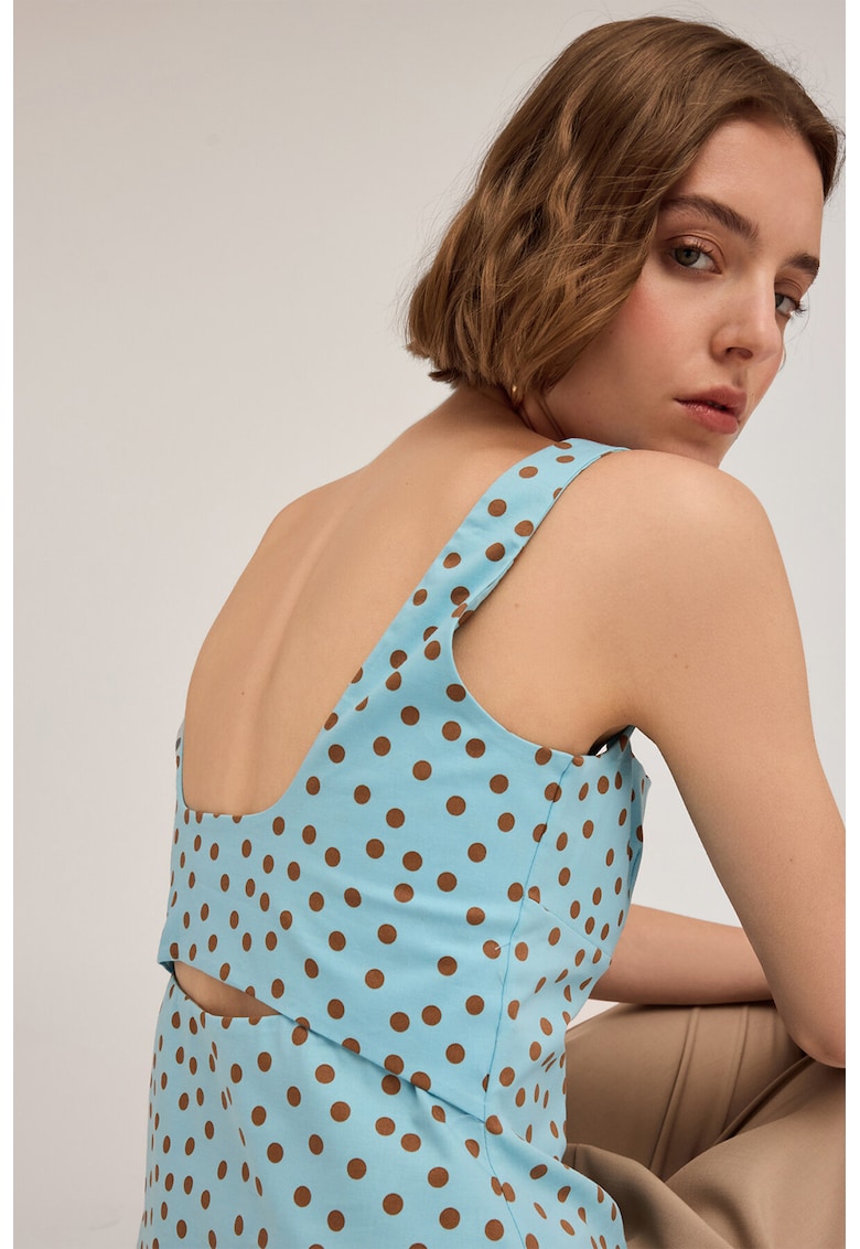 - albastru glaciar Imprimeu: buline Stil: casual Croiala: regular fit Sistem inchidere: fermoar Material: sintetic Decolteu: patrat Lungime maneca: fara maneca Detalii: decupaj pe spate Compozitie Exterior: 97% bumbac