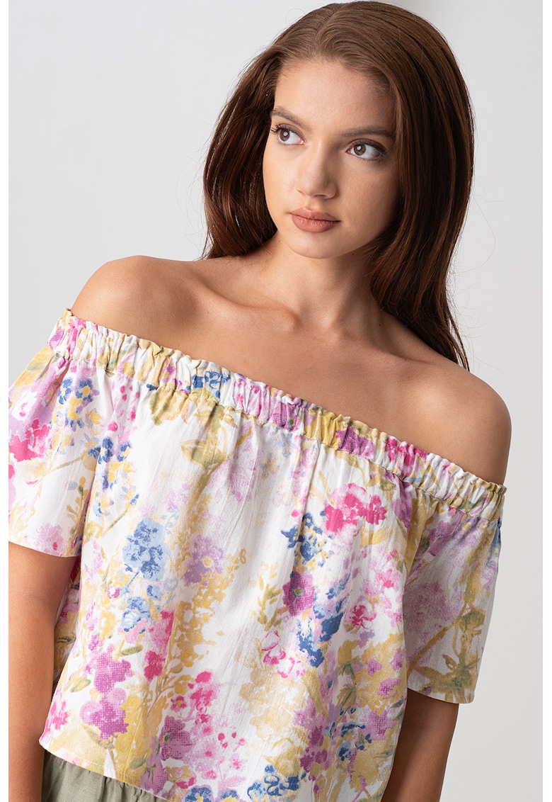 Caracteristici Culoare: multicolor Imprimeu: floral Stil: casual Croiala: decolteu pe umeri Sistem inchidere: fara inchidere Material: bumbac organic Decolteu: drept Lungime maneca: maneca medie Compozitie Exterior: 100% bumbac organic Info model Modelul poarta un produs de marimea S. Marimi model: 174 cm inaltime