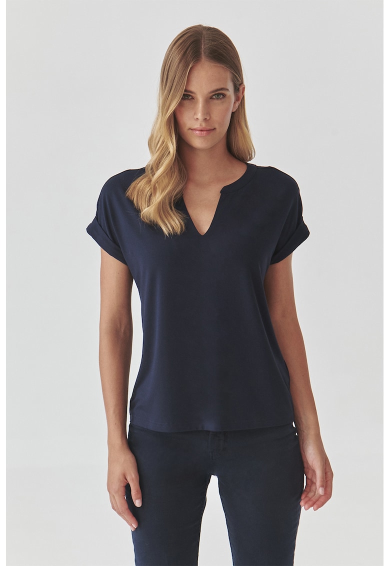 Caracteristici Culoare: albastru ultramarin Imprimeu: uni Stil: casual Croiala: regular fit Sistem inchidere: fara inchidere Material: viscoza Decolteu: rotund cu decupaj in v Lungime maneca: maneca scurta Compozitie Exterior: 90% viscoza