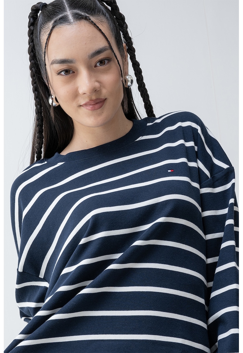 - albastru ultramarin Imprimeu: dungi Stil: casual Croiala: lejer Sistem inchidere: fara inchidere Material: bumbac Decolteu: la baza gatului Lungime maneca: maneca lunga Compozitie Exterior: 100% bumbac Info model Modelul poarta un produs de marimea S. Marimi model: 170 cm inaltime
