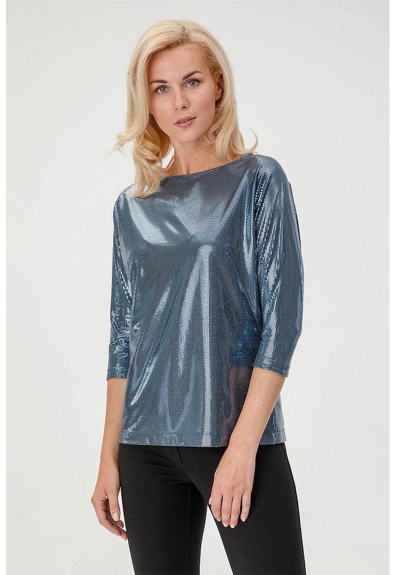 Caracteristici Culoare: albastru deschis Imprimeu: uni Stil: elegant Croiala: regular fit Sistem inchidere: fara inchidere Material: poliester Decolteu: rotund Lungime maneca: maneca trei sferturi Detalii: efect holografic Compozitie Exterior: 100% poliester