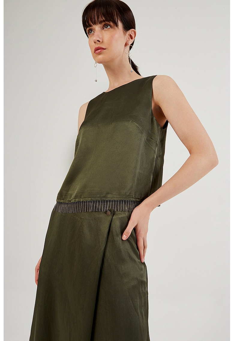 Caracteristici Culoare: kaki Imprimeu: uni Stil: elegant Croiala: regular fit Sistem inchidere: fara inchidere Material: sintetic Decolteu: rotund Lungime maneca: fara maneca Detalii: franjuri