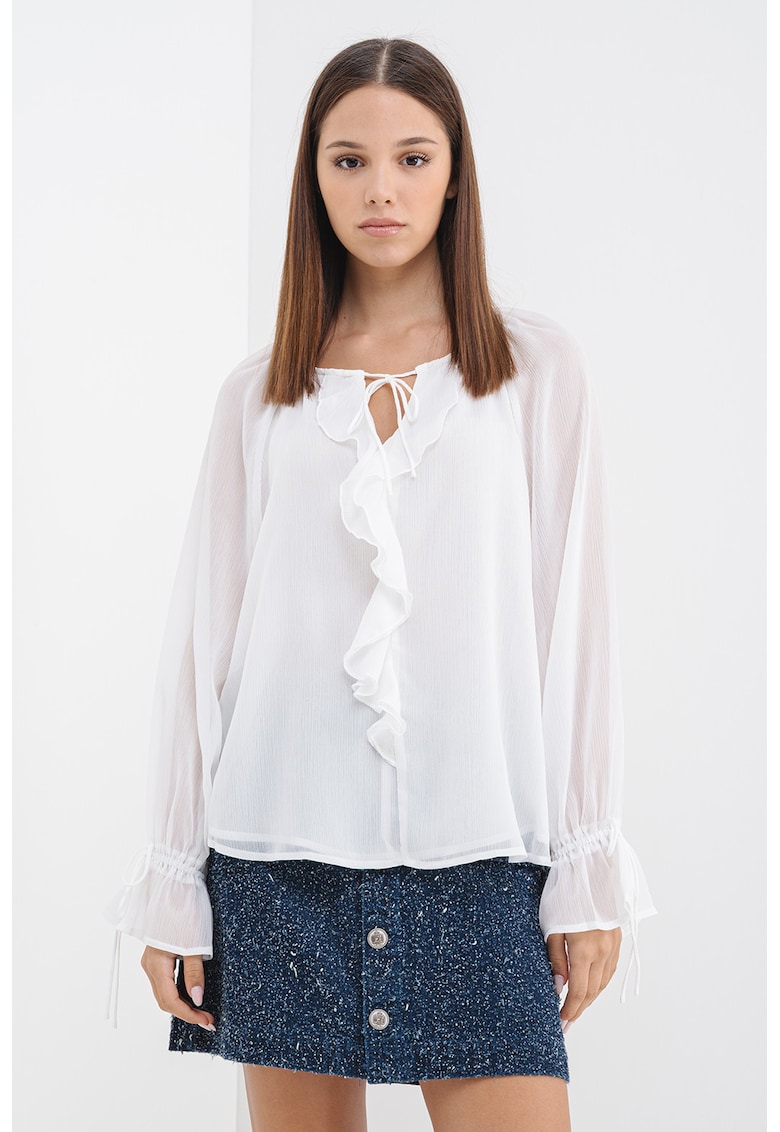 Caracteristici Culoare: alb murdar Imprimeu: uni Stil: casual Croiala: lejer Material: poliester Decolteu: rotund Lungime maneca: maneca lunga Detalii: garnituri cu volane Compozitie Exterior: 100% poliester reciclat Info model Modelul poarta un produs de marimea S. Marimi model: 174 cm inaltime