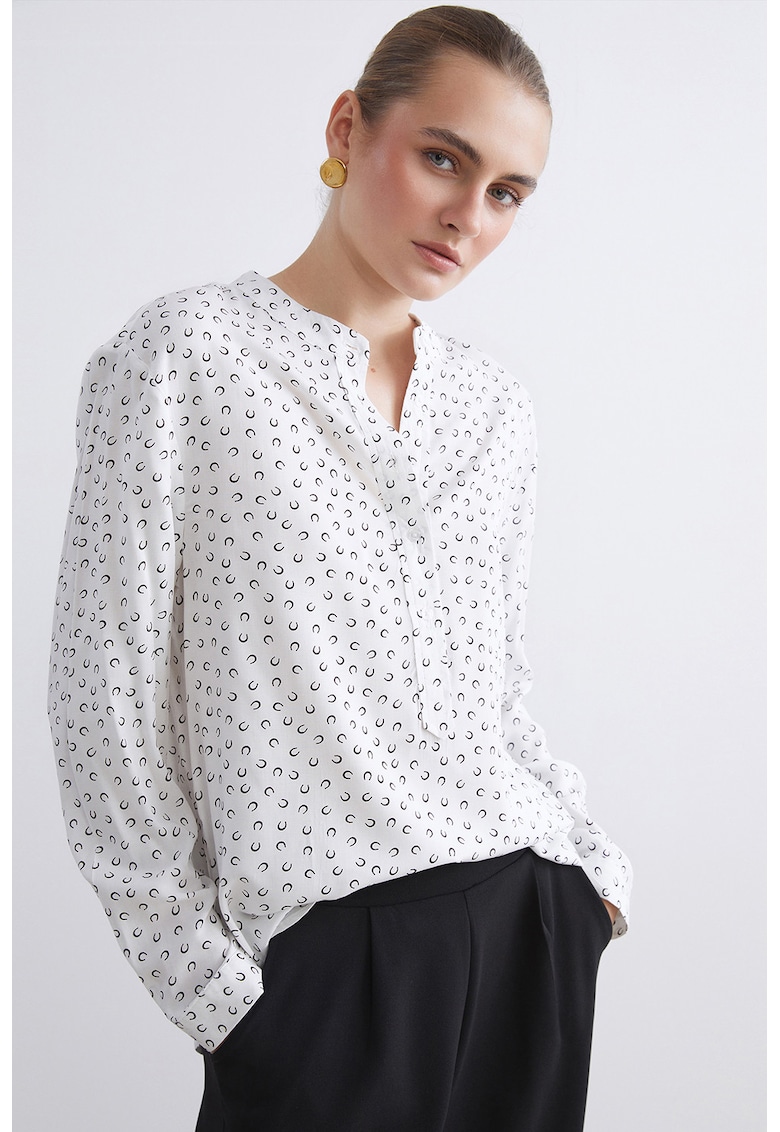 Caracteristici Culoare: alb murdar Imprimeu: buline Stil: casual Croiala: regular fit Sistem inchidere: fara inchidere Material: viscoza Decolteu: la baza gatului Maneci: cu mansete cu nasturi Lungime maneca: maneca lunga Detalii: fenta scurta cu nasturi Compozitie Exterior: 100% viscoza