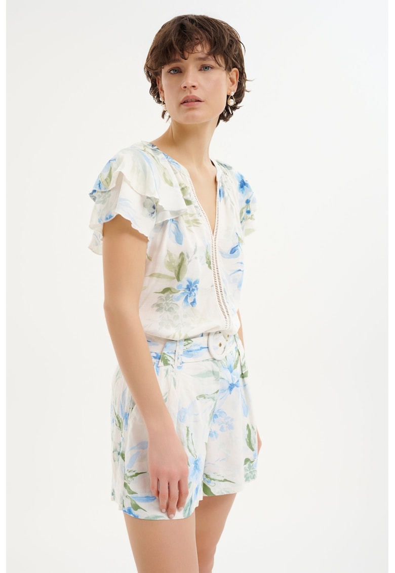 - albastru Imprimeu: floral Stil: casual Croiala: regular fit Sistem inchidere: fara inchidere Material: viscoza Decolteu: in v Guler: scurt Maneci: fluture Lungime maneca: maneca scurta Compozitie Exterior: 100% viscoza
