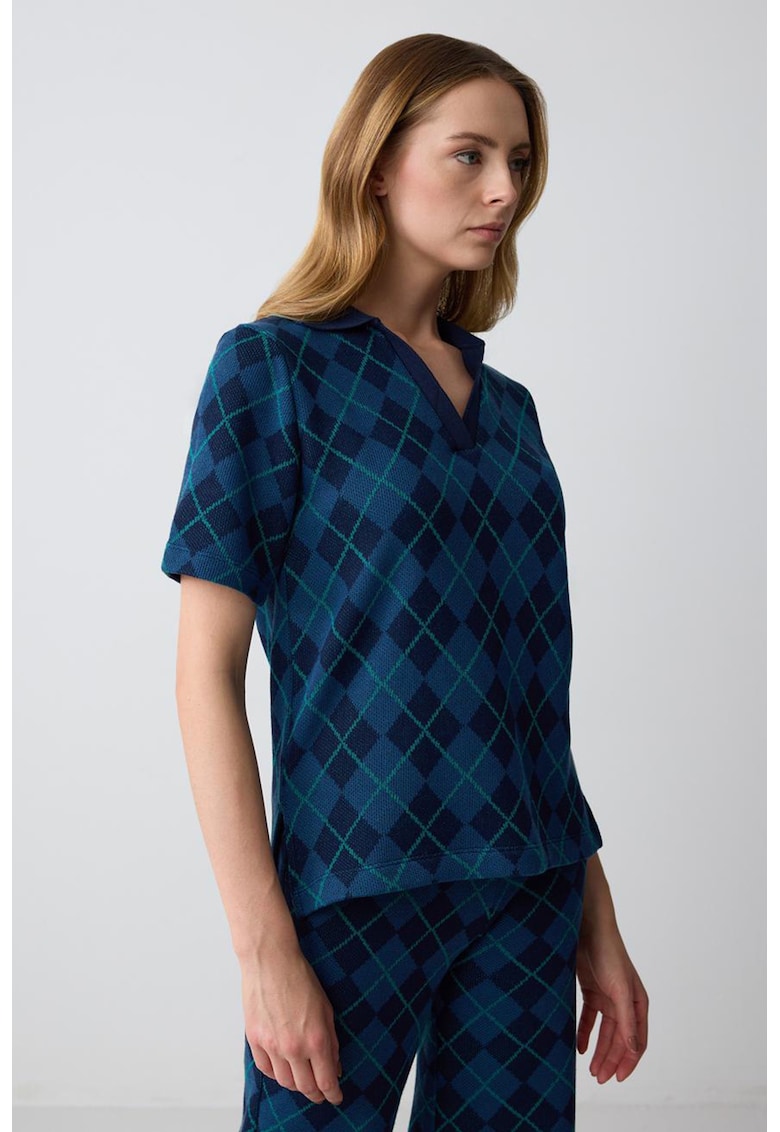 - bleumarin Imprimeu: carouri Stil: casual Croiala: regular fit Sistem inchidere: fara inchidere Material: sintetic Guler: clasic Lungime maneca: maneca scurta Compozitie Exterior: 65% poliester