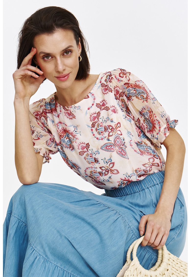 - albastru deschis Imprimeu: floral Stil: casual Croiala: regular fit Sistem inchidere: fara inchidere Material: poliester Decolteu: rotund Maneci: cu mansete elastice