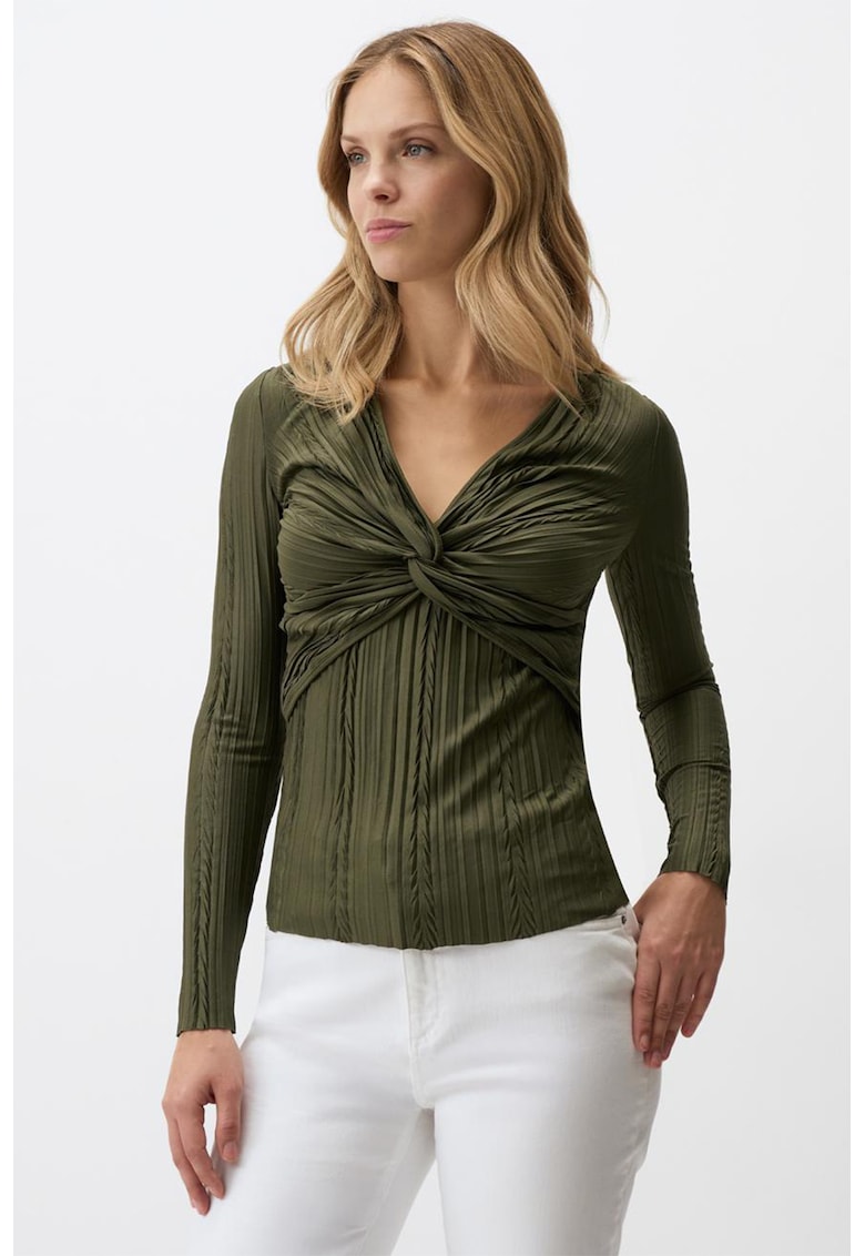 Caracteristici Culoare: verde militar inchis Imprimeu: uni Stil: casual Croiala: regular fit Sistem inchidere: fara inchidere Material: poliester Decolteu: v Lungime maneca: maneca lunga Detalii: detaliu cu nod pe partea din fata