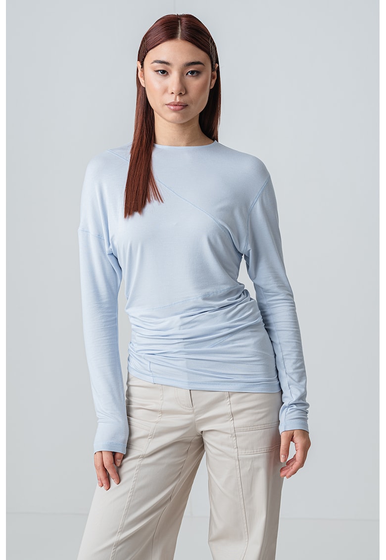Caracteristici Culoare: albastru lavanda Imprimeu: uni Stil: casual Croiala: regular fit Sistem inchidere: fara inchidere Material: viscoza Decolteu: la baza gatului Lungime maneca: maneca lunga Detalii: fronseuri Compozitie Exterior: 94% viscoza