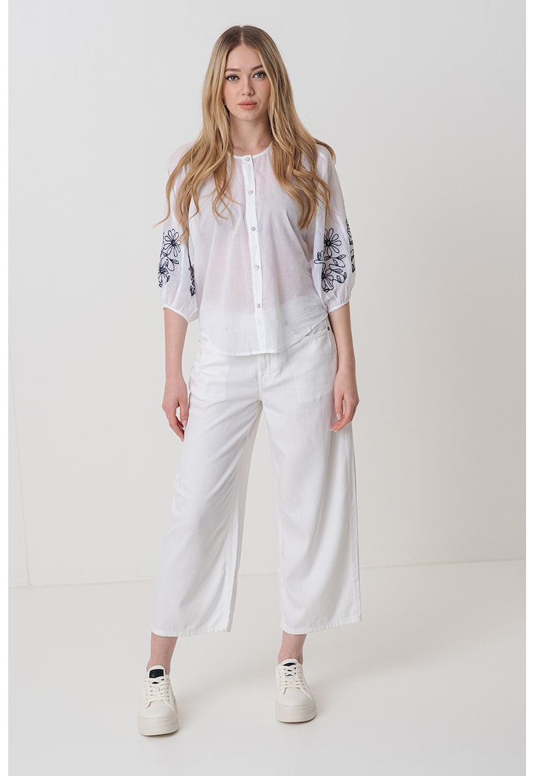 - albastru ultramarin Imprimeu: uni Stil: casual Croiala: regular fit Sistem inchidere: nasturi Material: bumbac Maneci: bufante Lungime maneca: maneca trei sferturi Compozitie Exterior: 100% bumbac Info model Modelul poarta un produs de marimea S. Marimi model: 175 cm inaltime