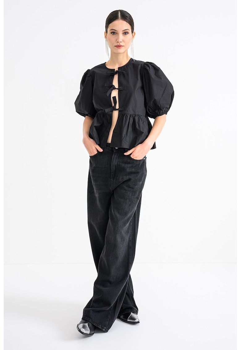 Caracteristici Culoare: negru Imprimeu: uni Stil: elegant Croiala: regular fit Sistem inchidere: snur Material: bumbac Decolteu: la baza gatului Maneci: bufante Lungime maneca: maneca scurta Compozitie Exterior: 100% bumbac Info model Modelul poarta un produs de marimea S/36 IT. Marimi model: 176 cm inaltime