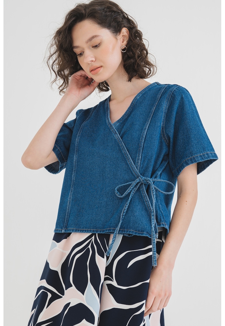 Caracteristici Culoare: albastru inchis Imprimeu: uni Stil: casual Croiala: regular fit Sistem inchidere: snur Material: denim Decolteu: cache-coeur Lungime maneca: maneca scurta Compozitie Exterior: 79% bumbac