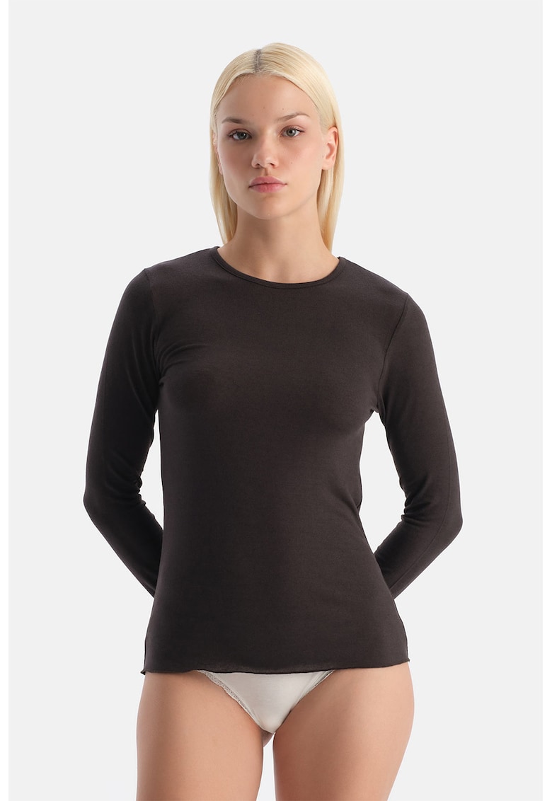 - modal Imprimeu: uni Decolteu: la baza gatului Croiala: slim fit Lungime maneca: maneca lunga Sistem inchidere: fara inchidere Compozitie Exterior: 85% modal