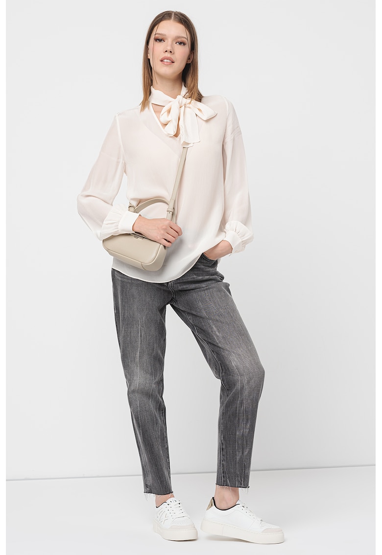 Caracteristici Culoare: crem Imprimeu: uni Stil: casual Croiala: regular fit Sistem inchidere: fara inchidere Material: plasa Guler: funda de panglici Lungime maneca: maneca lunga Compozitie Exterior: 100% viscoza Info model Modelul poarta un produs de marimea S. Marimi model: 176 cm inaltime