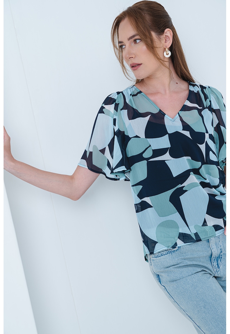 - verde pal Imprimeu: abstract Stil: casual Croiala: regular fit Sistem inchidere: fara inchidere Material: sintetic Decolteu: in v Maneci: fluture Lungime maneca: maneca scurta Detalii: material sifon Compozitie Exterior: 100% poliester Info model Modelul poarta un produs de marimea S/36 EU. Marimi model: 180 cm inaltime