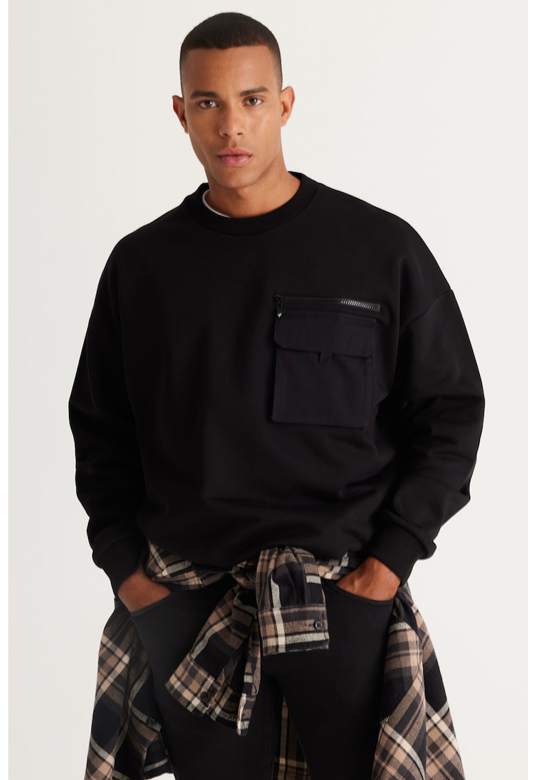 Caracteristici Tip produs: bluza de trening Culoare: negru Imprimeu: uni Material: bumbac Croiala: regular fit Decolteu: la baza gatului Sistem inchidere: fara inchidere Buzunare: pe piept Maneci: cazute Lungime maneca: maneca lunga Compozitie Exterior: 100% bumbac