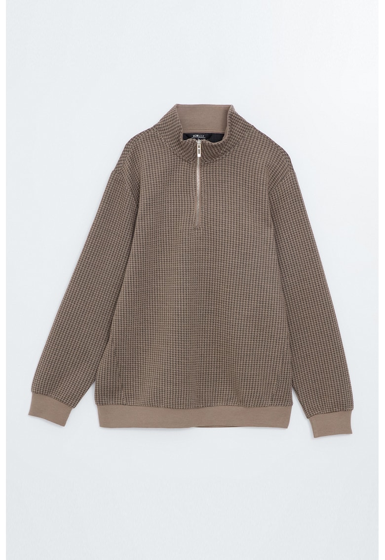 Caracteristici Tip produs: bluza de trening Culoare: maro deschis Imprimeu: houndstooth Material: sintetic Croiala: regular fit Sistem inchidere: fara inchidere Lungime maneca: maneca lunga Detalii: fenta cu fermoar Compozitie Exterior: 82% poliester