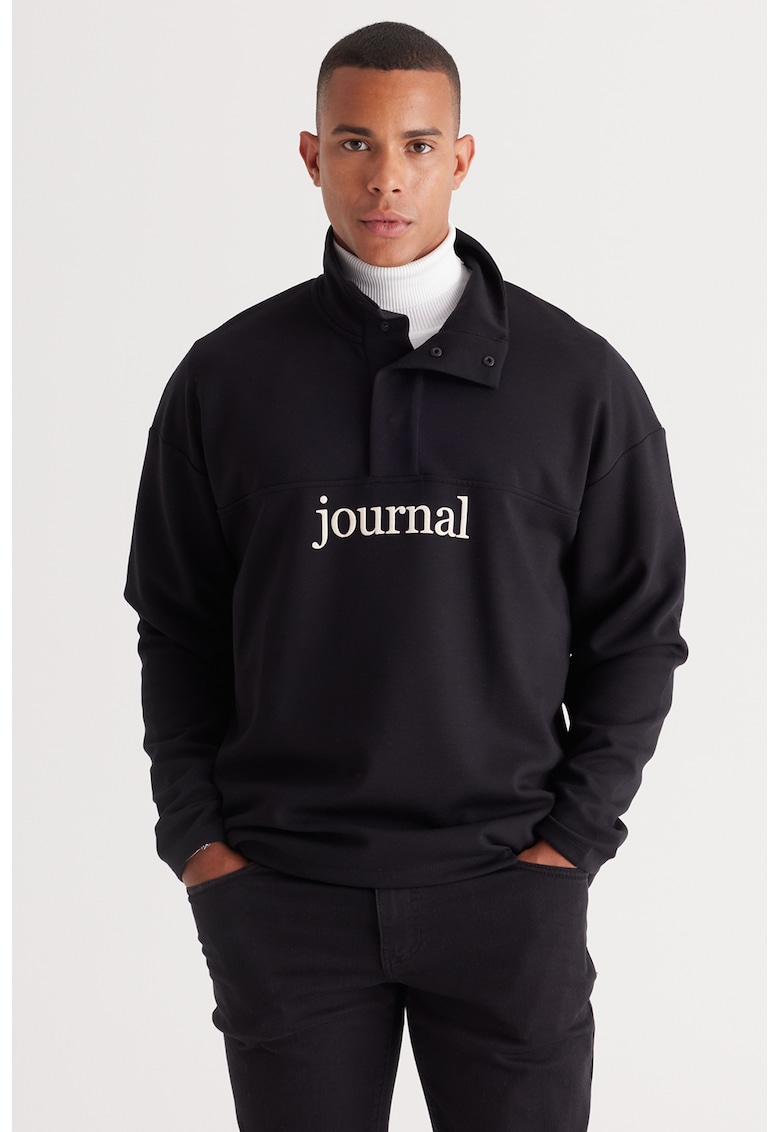 Caracteristici Tip produs: bluzon Culoare: negru Imprimeu: text Material: sintetic Croiala: regular fit Sistem inchidere: fara inchidere Lungime maneca: maneca lunga Detalii: fenta cu capse Compozitie Exterior: 79% poliester