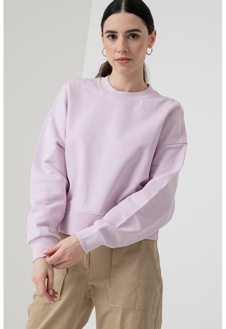 Caracteristici Tip produs: bluza de trening Culoare: lila Imprimeu: uni Croiala: lejer Sistem inchidere: fara inchidere Material: bumbac Lungime maneca: maneca lunga Compozitie Exterior: 100% bumbac Info model Modelul poarta un produs de marimea S. Marimi model: 177 cm inaltime