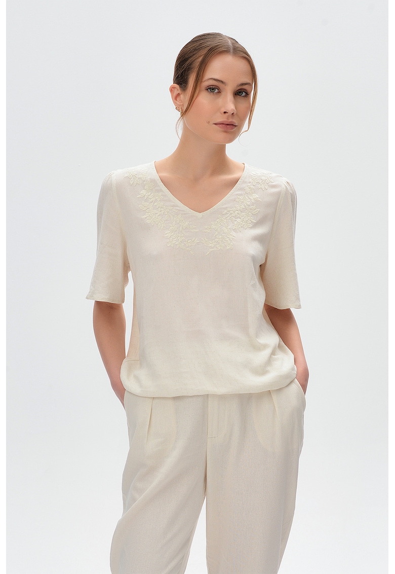- in Decolteu: in v Lungime maneca: maneca medie Detalii: broderii florale Compozitie Exterior: 85% viscoza