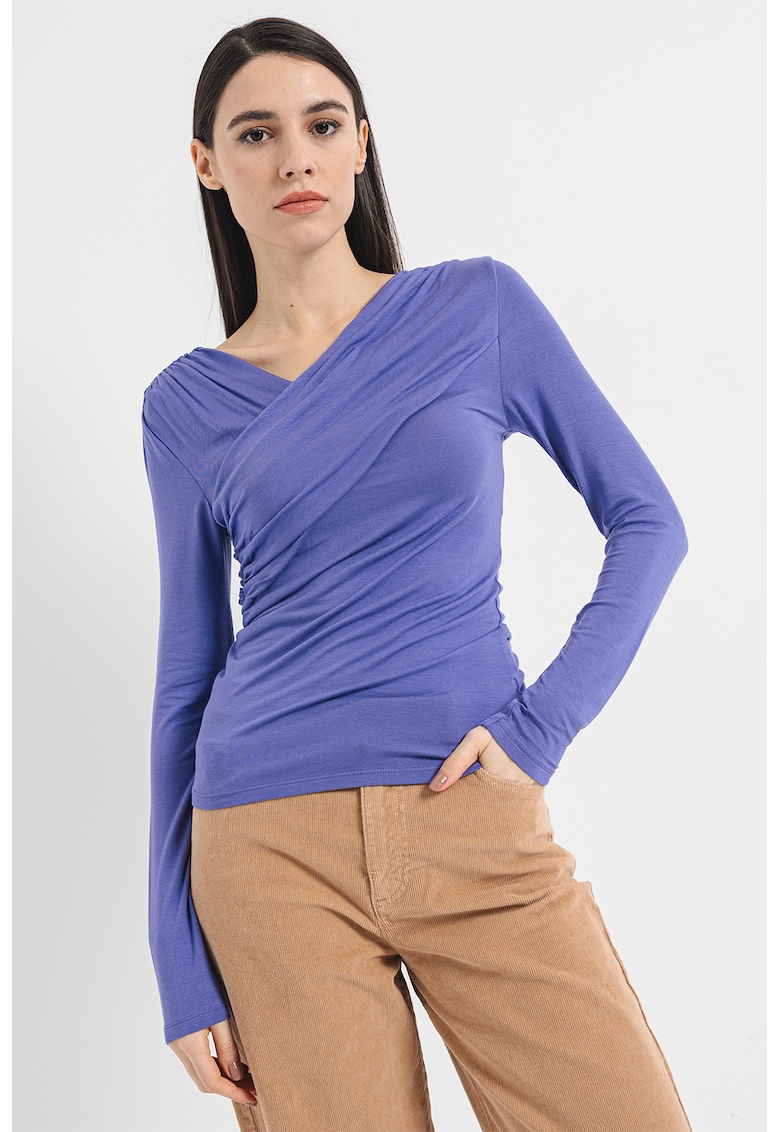 Caracteristici Culoare: violet Imprimeu: uni Stil: casual Croiala: slim fit Sistem inchidere: fara inchidere Material: modal Decolteu: in v Lungime maneca: maneca lunga Detalii: aspect drapat Compozitie Exterior: 95% modal