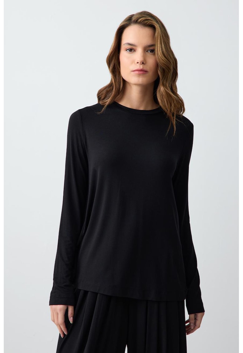 Caracteristici Culoare: negru Imprimeu: uni Stil: casual Croiala: lejer Sistem inchidere: fara inchidere Material: modal Decolteu: la baza gatului Lungime maneca: maneca lunga Detalii: decupaj pe partea din spate Compozitie Exterior: 95% modal