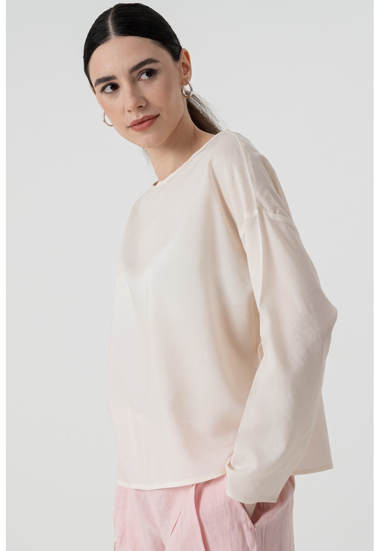 Caracteristici Culoare: crem Imprimeu: uni Stil: casual Croiala: lejer Material: lyocell Decolteu: rotund Maneci: maneci cazute Lungime maneca: maneca lunga Compozitie Exterior: 100% lyocell Info model Modelul poarta un produs de marimea S. Marimi model: 177 cm inaltime