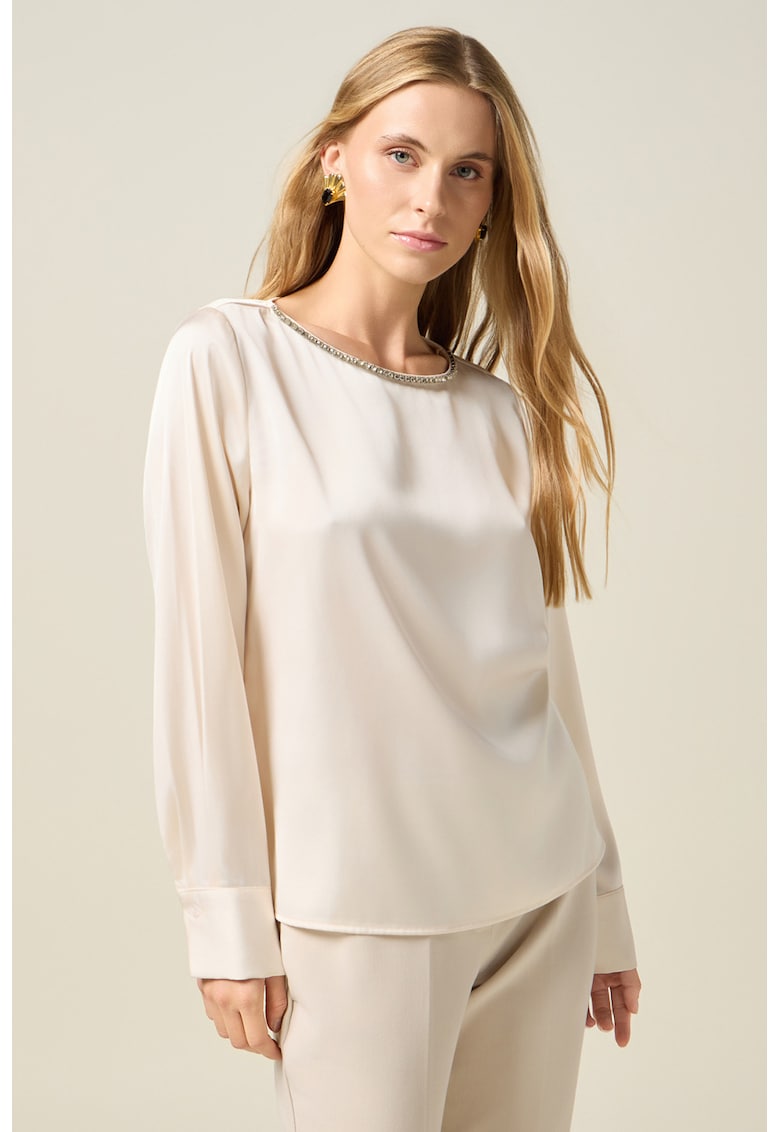 - satin Decolteu: barcuta Lungime maneca: maneca lunga Detalii: decolteu decorat cu strasuri Compozitie Exterior: 100% poliester