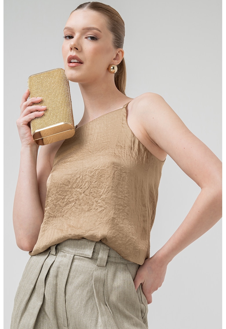 Caracteristici Culoare: maro nisip Imprimeu: uni Stil: casual Croiala: regular fit Sistem inchidere: fara inchidere Material: acetat Decolteu: rotund Lungime maneca: fara maneca Detalii: aspect satinat Compozitie Exterior: 100% acetat Info model Modelul poarta un produs de marimea S. Marimi model: 176 cm inaltime
