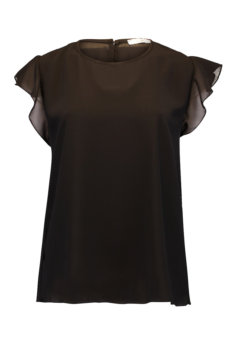 Caracteristici Culoare: negru Imprimeu: uni Stil: casual Croiala: regular fit Sistem inchidere: nasturi Material: sintetic Decolteu: la baza gatului Maneci: fluture Lungime maneca: maneca scurta Detalii: partea din spate cu pliuri