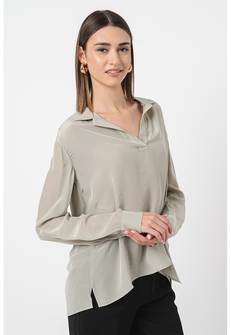 Caracteristici Culoare: verde sparanghel Imprimeu: uni Stil: elegant Croiala: lejer Sistem inchidere: fara inchidere Material: viscoza Decolteu: in v Lungime maneca: maneca lunga Detalii: aplicatie logo pe partea din spate