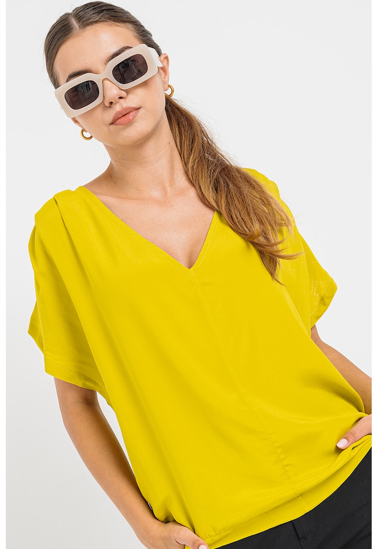 Caracteristici Culoare: verde fistic Imprimeu: uni Stil: casual Croiala: lejer Sistem inchidere: fara inchidere Material: viscoza Decolteu: in "v" Lungime maneca: maneca scurta Compozitie Exterior: 100% viscoza Info model Modelul poarta un produs de marimea S. Marimi model: 173 cm inaltime