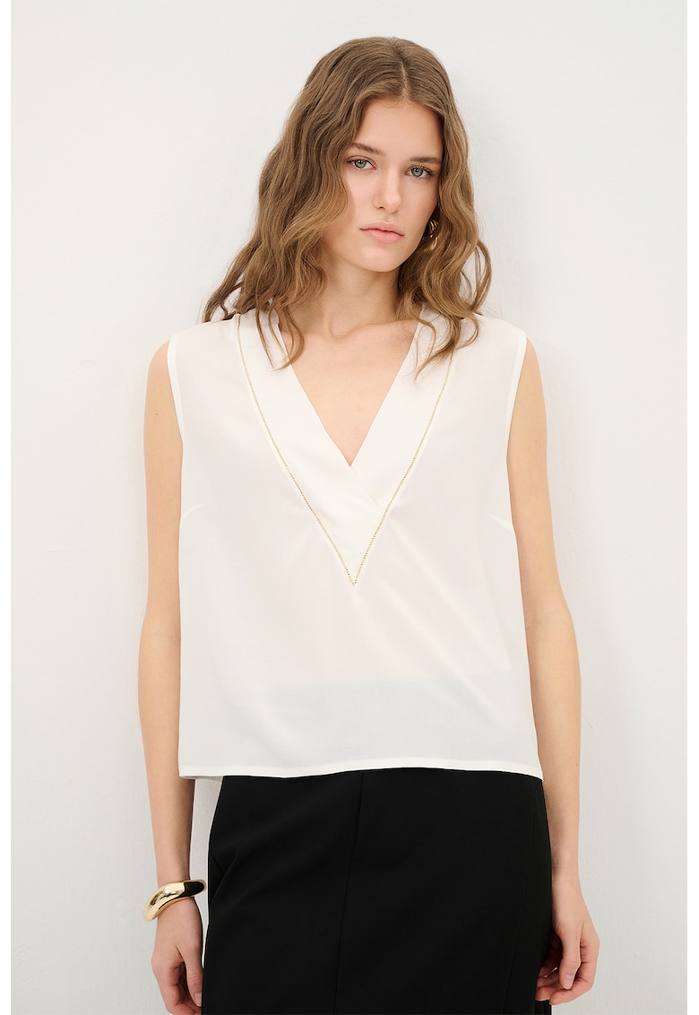 Caracteristici Culoare: alb fildes Imprimeu: uni Stil: elegant Croiala: lejer Material: viscoza Decolteu: in v Lungime maneca: fara maneca Detalii: marimea este mai mica decat standardul