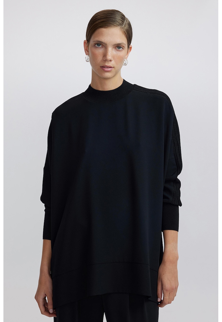 Caracteristici Culoare: negru Imprimeu: uni Stil: casual Croiala: lejer Sistem inchidere: fara inchidere Material: poliester Guler: scurt Lungime maneca: maneca trei sferturi Detalii: terminatie asimetrica