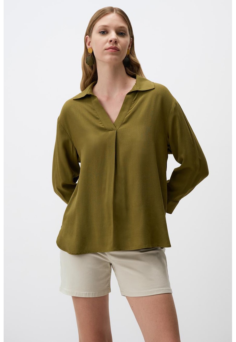 Caracteristici Culoare: verde masliniu Imprimeu: uni Stil: casual Croiala: lejer Sistem inchidere: fara inchidere Material: viscoza Decolteu: in v Guler: clasic Maneci: cu mansete cu nasturi Lungime maneca: maneca lunga Compozitie Exterior: 100% viscoza Info model Modelul poarta un produs de marimea S. Marimi model: 176 cm inaltime
