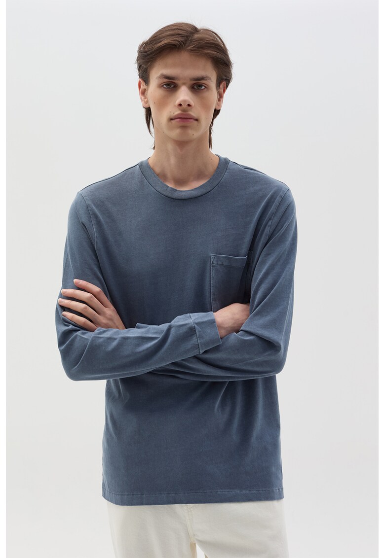 Caracteristici Culoare: albastru prafuit Imprimeu: uni Material: bumbac Stil: casual Croiala: lejer Sistem inchidere: fara inchidere Decolteu: la baza gatului Lungime maneca: maneca lunga Buzunare: unul aplicat pe piept Compozitie Exterior: 100% bumbac