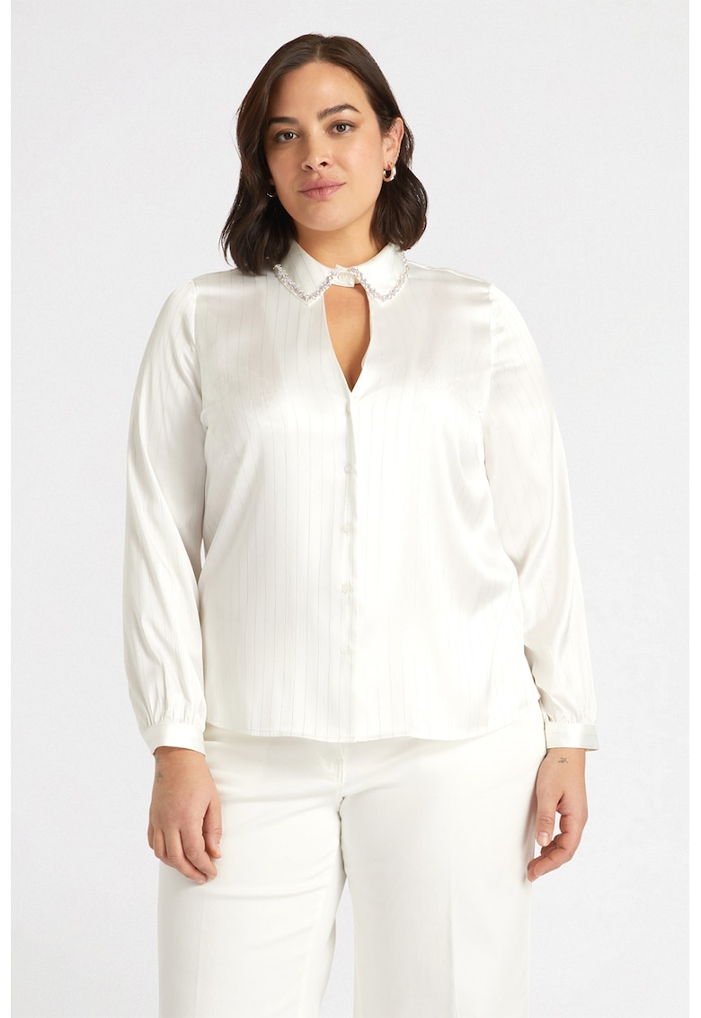 Caracteristici Culoare: alb murdar Imprimeu: dungi Stil: casual Croiala: curvy Sistem inchidere: nasturi Material: sintetic Guler: ascutit Lungime maneca: maneca lunga Detalii: acest produs se adreseaza femeilor cu forme pline (plus size).