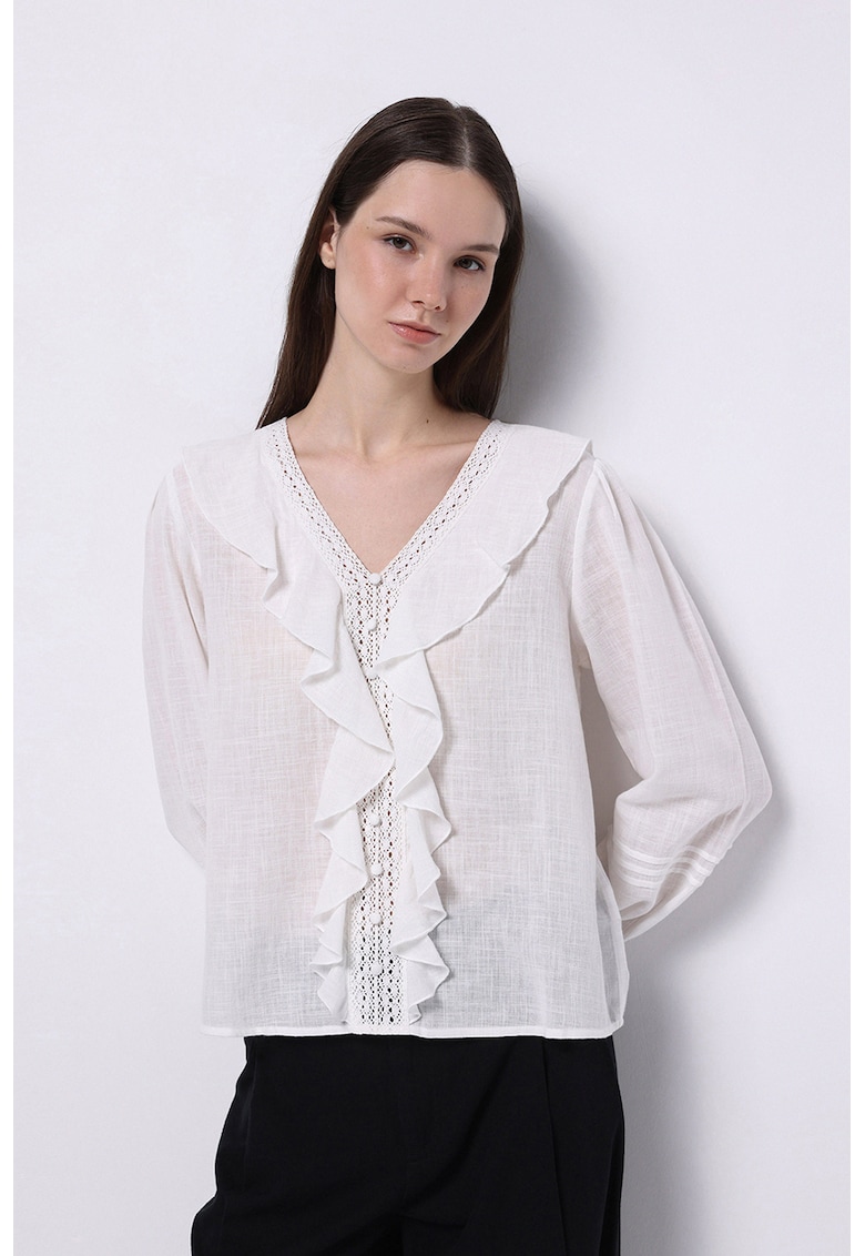 Caracteristici Culoare: alb Imprimeu: uni Stil: casual Croiala: regular fit Sistem inchidere: fara inchidere Material: bumbac Decolteu: in v Maneci: bufanta Lungime maneca: maneca lunga Detalii: volane