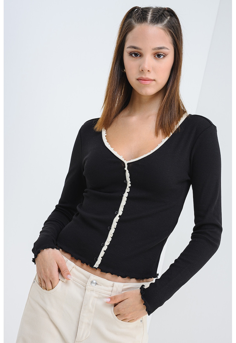 - negru stins Imprimeu: uni Stil: casual Croiala: slim fit Sistem inchidere: nasturi Material: bumbac Decolteu: in v Lungime maneca: maneca lunga Compozitie Exterior: 95 bumbac
